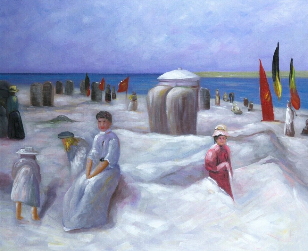 Het schilderij wordt op de Duitse site van eBay aangeboden voor de somma van € 80 en niet minder. Het is getiteld: “Am Strand von Nordwijk” en krijgt de beledigende toevoeging mee “Ein handgemaltes Ölbild nach Max Liebermann.” Beledigend zowel voor Max Liebermann als voor de badplaats Noordwijk.