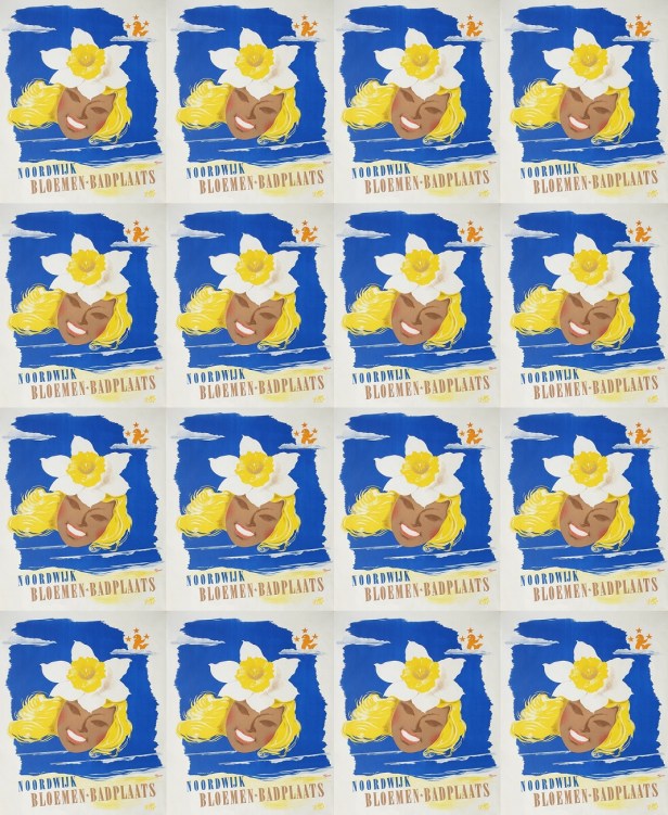 Uitsnede uit een poster die diende tot meerdere eer en glorie van het toerisme in Noordwijk: ‘Bloemen-Badplaats’. Die combinatie wordt hier uitgebeeld door een vrouwenhoofd dat amper boven water komt en eennarcis op haar conterfeitsel.