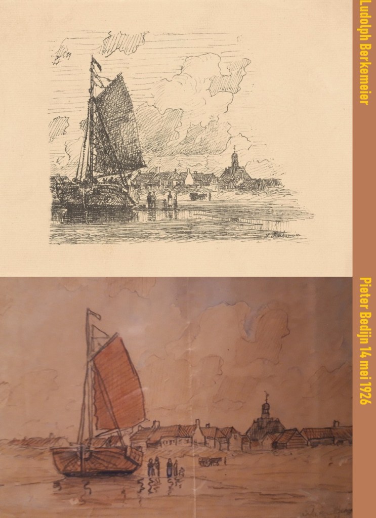 Ron komt met deze twee kunstwerken aandragen op JBEEN. Frappante beelden, want dezelfde. Pieter Bedijn schilderde zijn versie waarschijnlijk naar de tekening van Berkemeier. Of misschien toch andersom?