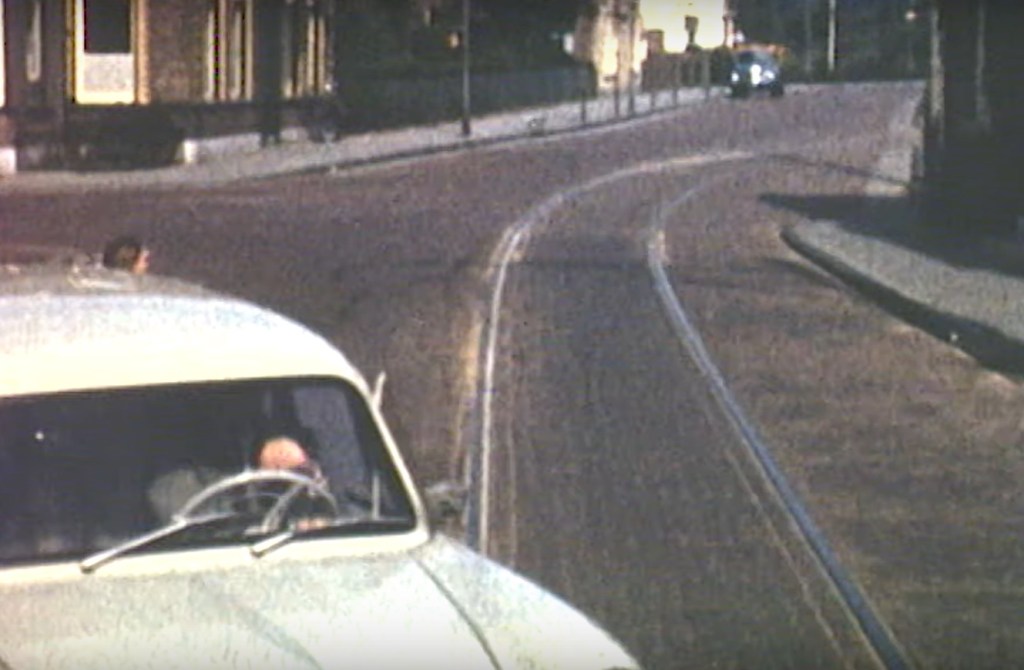 Still uit een filmpje over de Blauwe Tram tussen Leiden en Noordwijk/Katwijk. het beeld is er één vanuit de tram die richting Noordwijk aan Zee rijdt. Vanuit de Zeestraat met zicht op de Nieuwe Zeeweg en links de oude Duinrand apotheek.