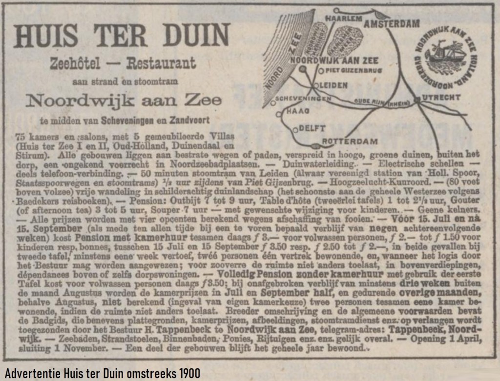 Advertentie van Huis ter Duin rond 1900 in een verders onbekend gebleven krant: “Alle prijzen worden met 4 opcenten berekend wegens afschaffing van fooien.”