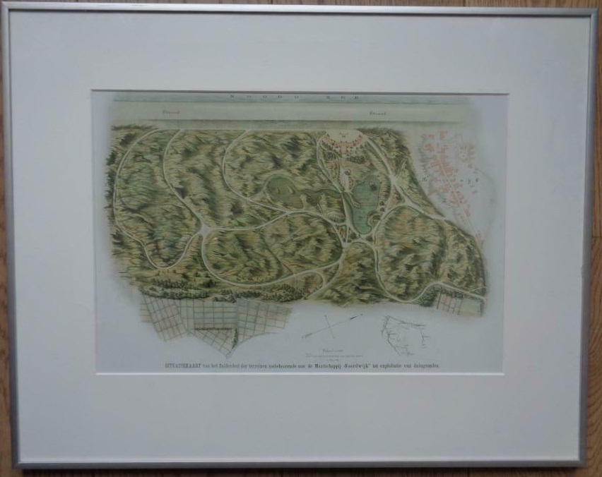 ‘Situatiekaart van het zuiderdeel der terreinen, toebehoorende aan de Maatschappij Noordwijk tot Exploitatie van Duingronden.´ Het is een reproductie van de originele kaart, die zich bevindt in het archief van de Faculteit Bouwkunde van de TU Delft. De kaart is van de hand van de gerenommeerde landschapsarchitect D. Wattez uit Bussum en dateert van rond 1884. Het begin van een ontwerp- en bouwwoede in de Zuidduinen (inclusief Huis ter Duin) onder leiding van een heus projectontwikkelings-bedrijf, de Maatschappij Noordwijk.