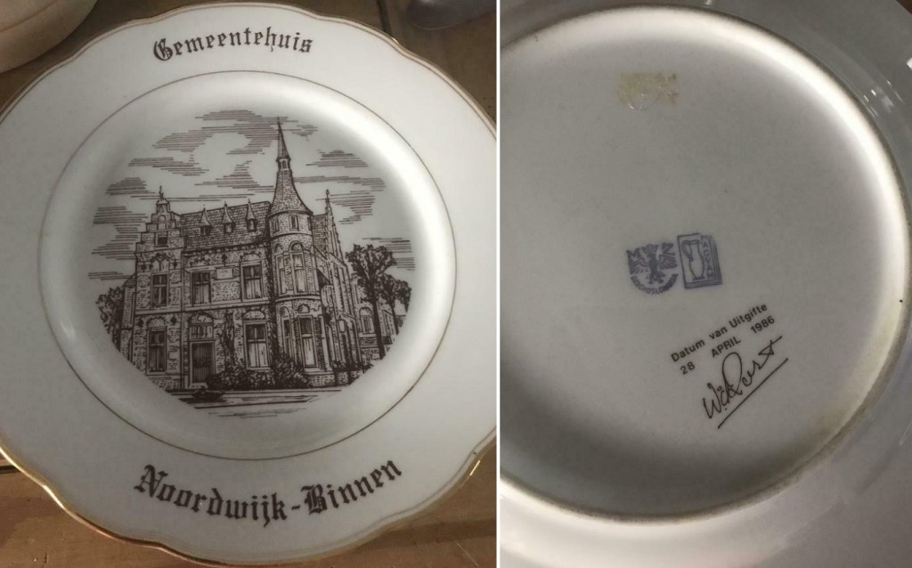 Bord te koop op marktplaats. Met een afbeelding van het Raadhuis aan de Voorstraat. De achterkant suggereert dat het bord bij een speciale gelegenheid is uitgegeven op 28 april 1986. En een onleesbare handtekening, ook dat nog. Wie weet hier meer van?
