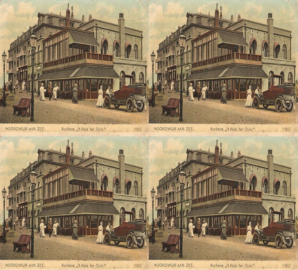 De foto is een plaatje op zich. Huis ter Duin en mooi volk en een schitterende auto en oude lantaarnpalen en dat alles in nostalgische kleuren.