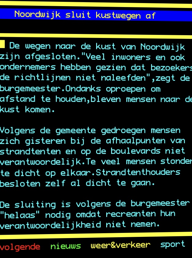 Vanwege het Coronavirus is het parool om de nodige afstand tot elkaar te bewaren om te voorkomen dat besmetting wat al te gemakkelijk kan plaatsvinden. Omdat op een mooi zonnige zaterdag opeens iedereen naar buiten ging – naar strand en bos – en wel in dusdanige hoeveelheden dat enige afstand tot elkaar helemaal niet meer mogelijk was, werden nieuwe maatregelen genomen in Zandvoort, Bloemendaal én …… Noordwijk: afsluiting van alle wegen naar het strand!