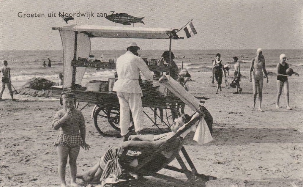 Nota Bene: het lijkt erop dat deze foto helemaal niet in Noordwijk genomen is. De strandstoel met luifeltje verraadt dat het hier om het strand van Zandvoort moet gaan. Van dat strand (en van die haringkar) bestaat nog een andere foto: