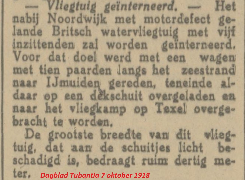 Het jaartal is 1918. Uit het Algemeen Handelsblad van 3 oktober 1918: geallieerd watervliegtuig wegens defect aan motor voor Noordwijk aan Zee geland (of te Noordwijk aan Zee). Bemanning bestond uit 3 Canadezen en 2 Engelsen, geïnterneerd. Vliegtuig onder militaire bewaking gesteld.