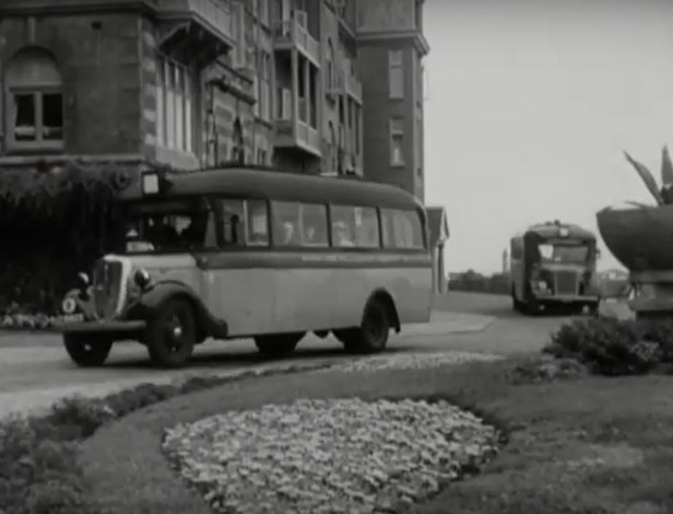 We schrijven ergens 1942. Twee bussen van de Noord- en Zuidhollandsche Vervoermaatschappij (NZHVM) voor Huis ter Duin. Foto uit een filmpje over een propagandabijeenkomst aldaar, georganiseerd door de NSB in samenwerking met de Duitse bezsetter.