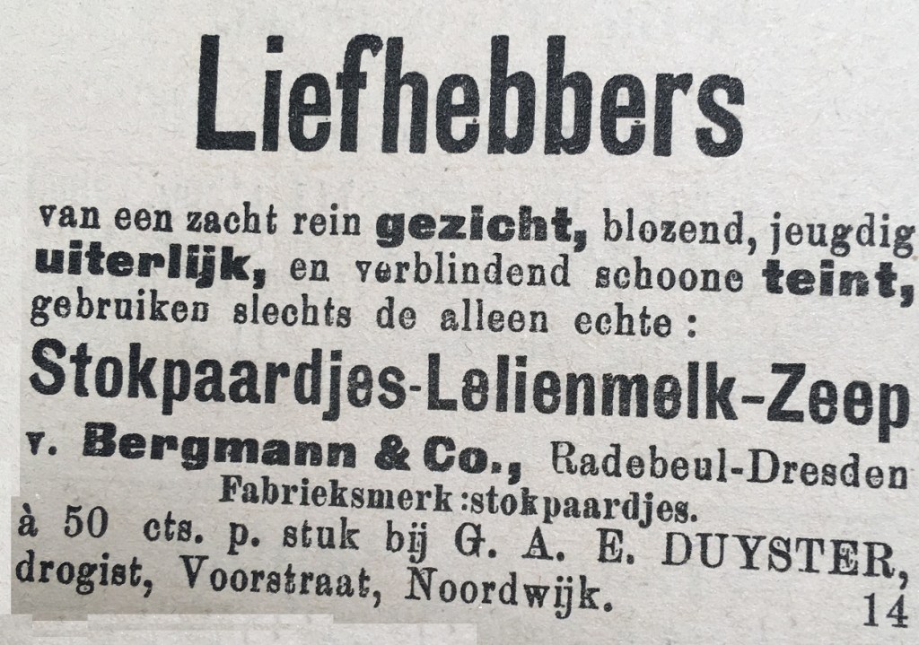 Ik heb nooit de aandrang gehad om mezelf in te smeren met Stokpaardjes Lelienmelkzeep. Maar als… dan zat ik in Noordwijk goed: het spul was in 1910 al te koop. Bij G.A.E Duyster aan de Voorstraat.
