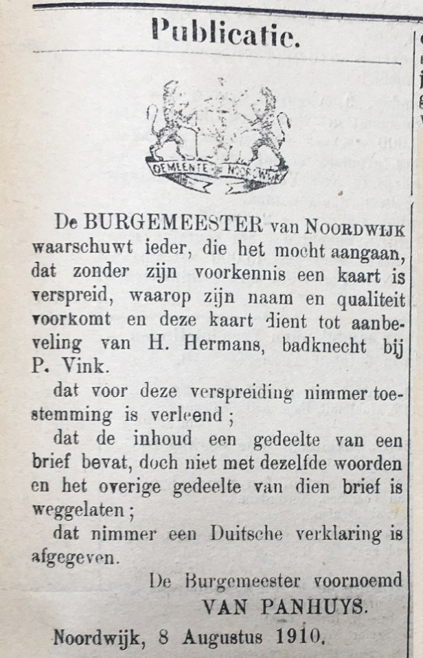 Ene H. Hermans had zich blijkbaar meester gemaakt van een brief van de burgemeester en die vervolgens in eigen bewoordingen gebruikt tot meerdere eer en glorie van zichzelve. De burgemeester – ook niet mis – nagelde Hermans publiekelijk aan de schandpaal middels een mededeling in de Noordwijker van 8 augustus 1910.
