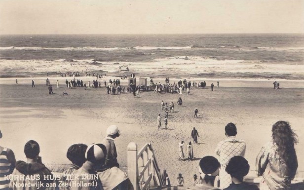 Bovenaan de trap bij Huis ter Duin had je een mooi overzicht over het strand, over de mensen die er samendrongen in zee en rond de laatste badkoetsen die er nog waren