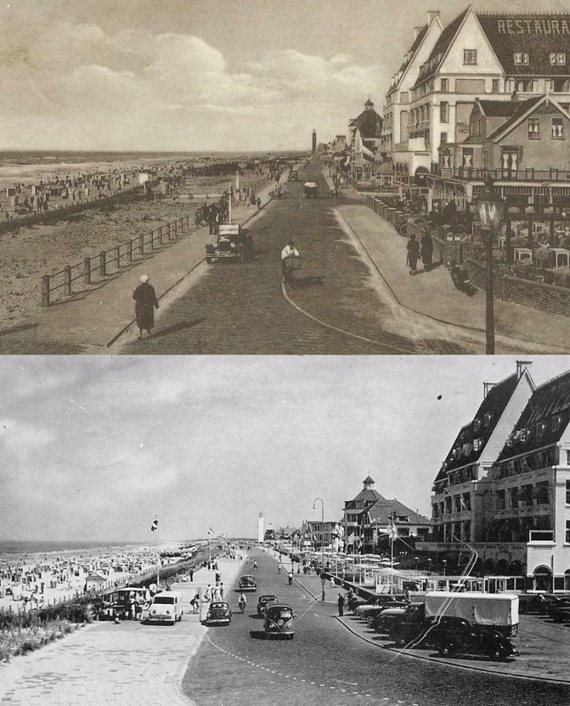 Twee foto’s vanaf dezelfde lokatie, maar vanuit andere tijden. De bovenste foto dateert van vóór de Tweede Wereldoorlog. Rechts is nog een stukje te zien van het terras van het Oranje Hotel en daarnaast de uitspanning “Im Weissen Rössl.”