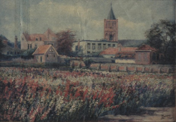 Schilderij van Noordwijk Binnen in de Jaren Dertig. Van een onbekende schilder, althans de signering is onleesbaar. Helaas.