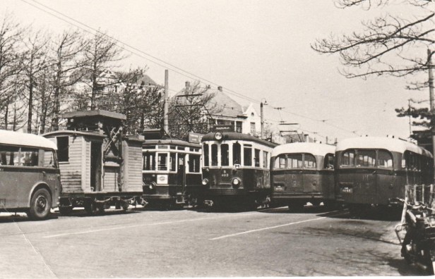 Nogal wat drukte aan de kop van de Huis ter Duinstraat, c.q. het Picképlein. Drie Crossley-bussen van de lijnen Den Haag-Haarlem en v.v.,l een Budapester tram van de lijn naar Leiden en een werkwagen als aanhanger bij een Leidse stadstram.