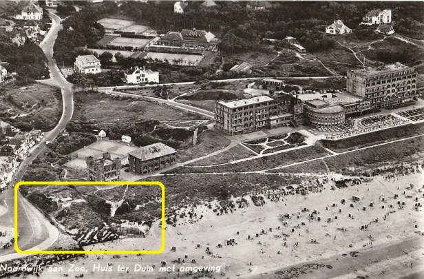 Foto van kort na de oorlog. Het bruisende badleven van Noordwijk aan Zee heeft de draad weer opgepikt. Maar de herinnering aan de oorlog is nog niet weggevaagd: linksonder de ruïne van de voormalige Villa Seehorst en daaronder een zwaar betonnen bunker.