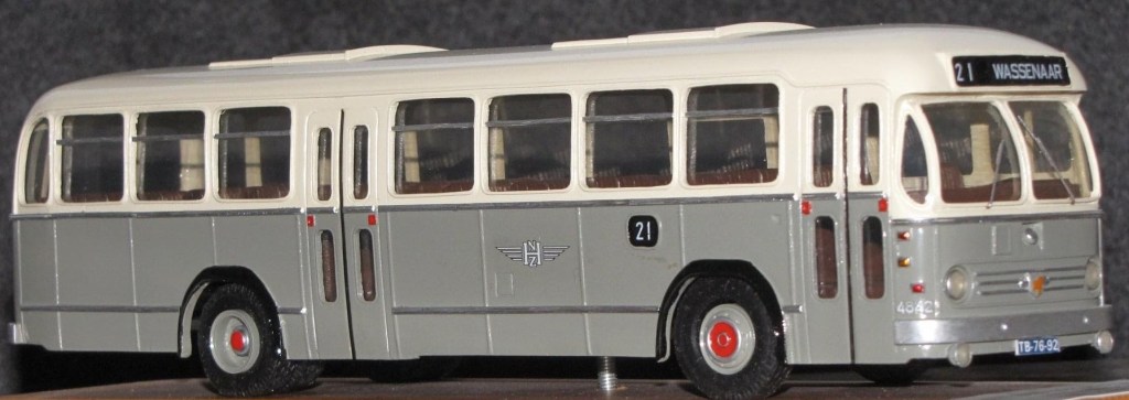 Prachtig model van de oude Leyland/Werkspoor bus van de NZH, ook wel ‘bolramer’ genoemd. Vaak mee gespoord, met die bus, ook in de tijd dat ze nog niet geel, maar grijs waren. Er waren ook exemplaren die blauw waren. Die werden doorgaans ingezet op de snelverbinding tussen Amsterdam en Den Haag, maar soms verdwaalde er ook wel eens eentje in Noordwijk, zoals onderstaande, die op de ‘echte lijn 2’ reed.