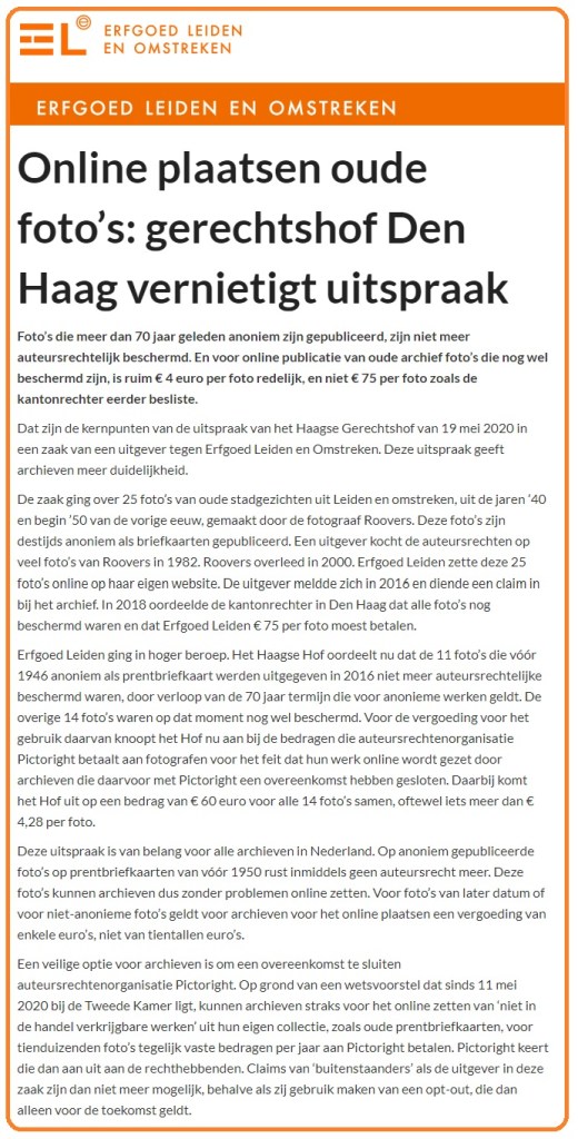 Het Regionaal Archief Leiden en Omstreken kreeg enkele jaren geleden ongenadig op zijn donder vanwege vermeend illegaal geplaatste foto’s op zijn website. Op straffe van hoge boetes zag het archief zich genoodzaakt om voor wat betreft het meeste beeldmateriaal ‘op zwart’ te gaan (zie boven). Helaas. Maar het archief liet het er gelukkig niet bij zitten en ging in hoger beroep en WON! Zie hieronder de gevolgen. Het ziet er naar uit dat we binnenkort weer grote delen van het beeldarchief (10.790 beelden van oud Noordwijk!!!) thuis kunnen raadplegen en vrijuit kunnen gebruiken.