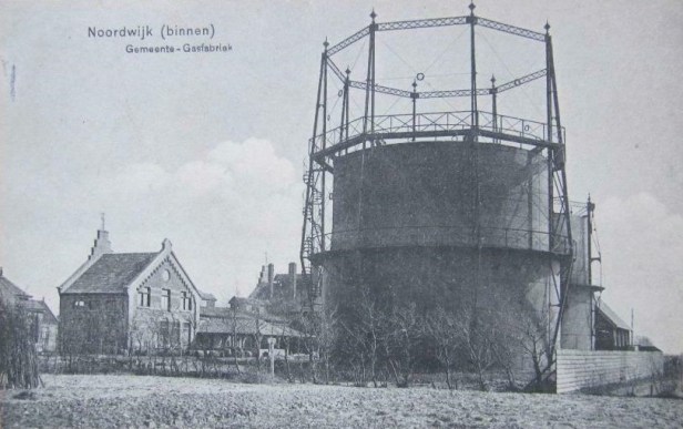 Oude ansichtkaart van de gashouders van de Noordwijkse gemeentelijke gasfabriek aan de Losplaatsweg. De geschiedenis van de gasfabriek is mooi beschreven door Michel van Dam in een boekje dat waarschijnlijk nog wel te scoren valt, is het niet bij de reguliere boekhandel dan toch zeker bij Moby Dick.