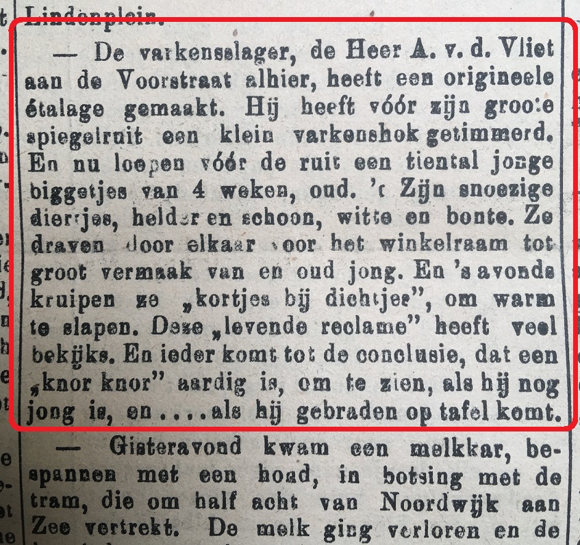 Slager Van Vliet van de Voorstraat moet een mieze middenstander zijn geweest, die smakeloosheid hoog in het vaandel voerde. De verslaggever van De Noordwijker was al even mies. Ik herinner me wel uithangborden bij slagers met een vrolijk lachende varkenskop erop. Ook mies en smakeloos. In het geval van van Vliet spreken we over het jaar 1913. Maar toch.