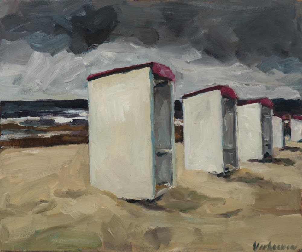 Schilderij van Helen Verhoeven (*1974) in olie en zand, daterend van rond 2000. Verdere toelichting: Painted in Noordwijk on a windy day, hence the choice of the artist to add sand grains to the paint. Helen Verhoeven lived between the USA and the Netherlands at the time, and according to the artist herself, the influence of both Hopper and Mesdag is visible in this painting.