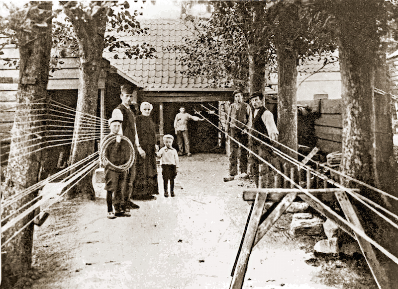 Enfin, dit zijn dus beelden van de touwslagerij van Passchier aan de Douzastraat. De lindebomen rechts op de foto hieronder stonden precies een Rijnlandse roede (3,767 meter) uit elkaar en dienden als maatstaf voor het touw.