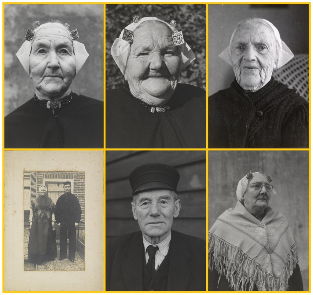 Op de site van het Openluchtmuseum in Arnhem komen we een paar echte oude Noortukkers tegen: met de klok mee van linksboven af: Dirkje Van der Wiel-Hazenoot, Elizabeth Duindam-Spaanderman, Neeltje Duindam-Hazenoot, Petronella van Beelen, Jan Ruigrok en het Echtpaar Overzeijl