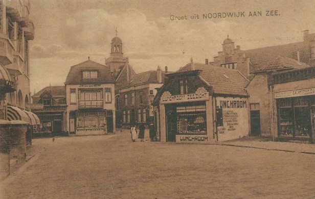 Het Calisplein in stemmig sepia. De bakkerij van Van der Werf en de galanterieënwinkel van Van der Leede waren dependances van winkels aan de Voorstraat in Noordwijk Binnen en niet andersom. Noordwijk aan Zee werd vanuit Noordwijk Binnen gekoloniseerd. Ook Adriaan Dorsman en Joh. Vegt rukten vanuit de Voorstraat op naar Zee. Konijnenburg was hen met zijn badhotel al vooruitgegaan. Ook vanaf de Voorstraat in Binnen (Hof van Holland).