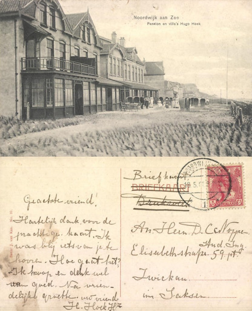 Hugo Hoek stuurde een kaartje aan ene Herrn Noppen in Zwickau. Gewoon in het Nederlands, daar ging Hugo niet moeilijk over doen. En hij gebruikte een ansichtkaart van zijn eigen pension en villa’s, uitgegeven door Jan van Kan.