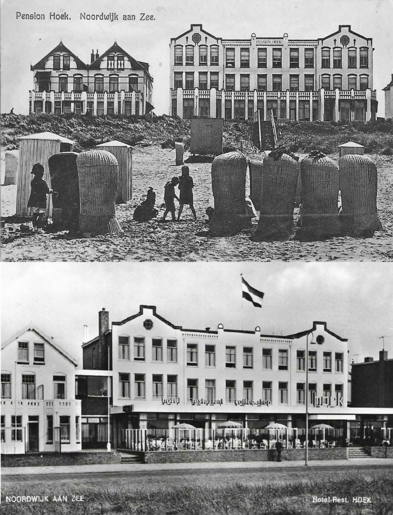 Twee foto’s van het voormalige Hotel Hoek aan de Noordboulevard in twee verschillende tijden. Op de site van Museum Noordwijk wordt het één en ander verhaald over de geschiedenis van dit hotel: