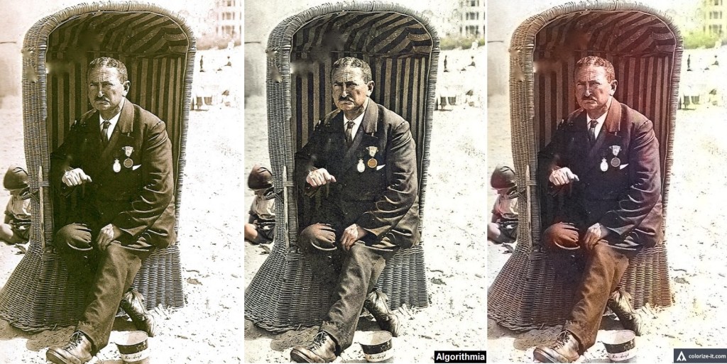 Jan – de Pompom – van Konijnenburg (1871-1956), telg uit het geslacht van de Van Konijnenburgen van het Hof van Holland én het Badhotel. Links de originele foto, rechts twee pogingen tot inkleuren met verschillende programmaatjes. De één werkt beter dan de andere, geen van de twee werkt perfect. Maar toch.