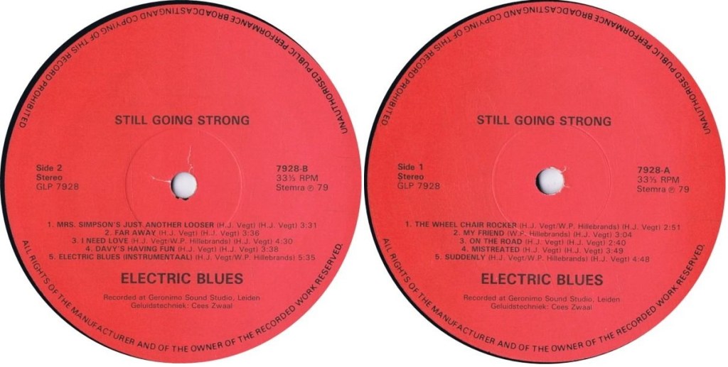 Te Koop aangeboden op catawiki.nl met de volgende toelichting: “Electric Blues – Still, Going Strong! (GLP 7928) made in Holland original first pressing LP | vinyl: NM (mint-) | cover: NM (mint-) / a very rare private pressing 500 copies of the dutch hardrock/wild psych/bluesrock band Electric Blues from Noordwijk, Netherlands”
