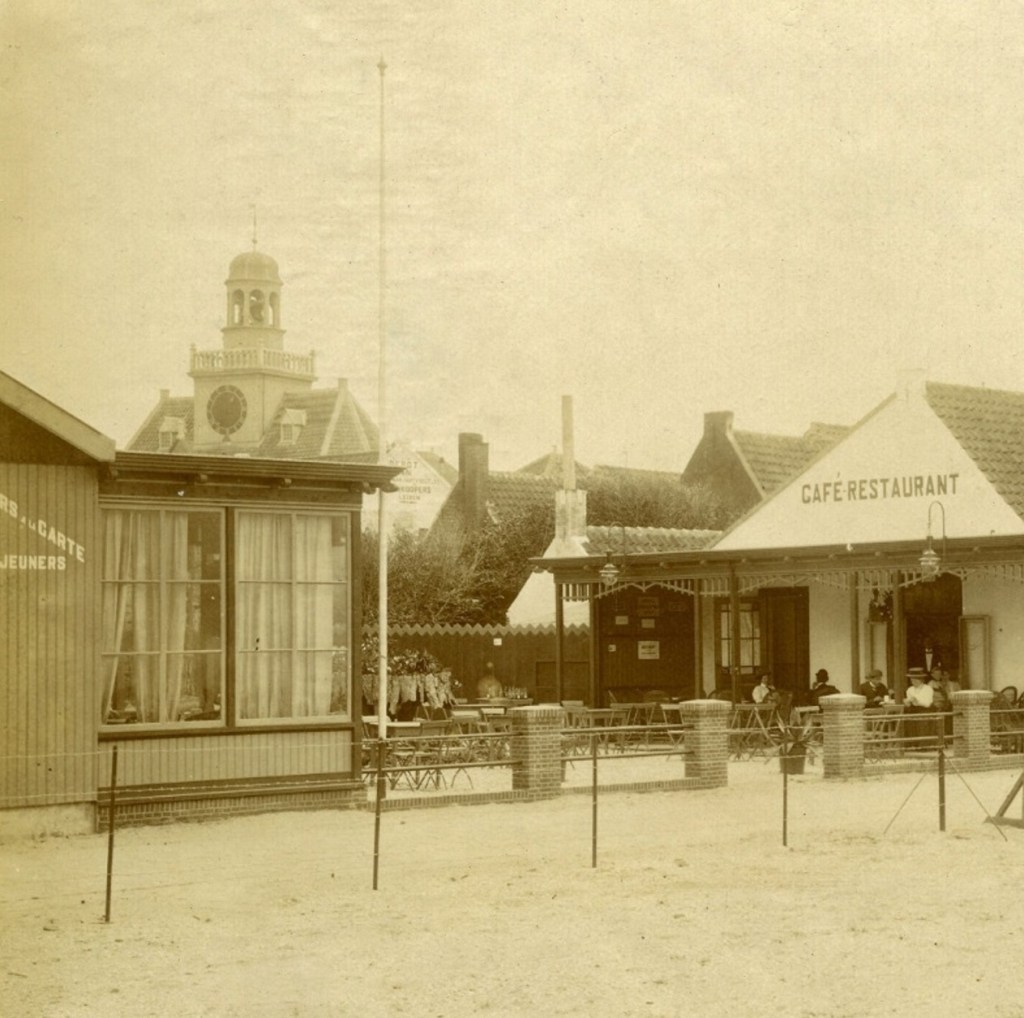 Blik op een deel van het terras van Café-Restaurant Badhotel Konijnenburg. Je zou bij wijze van spreken zo aan willen / kunnen schhuiven.