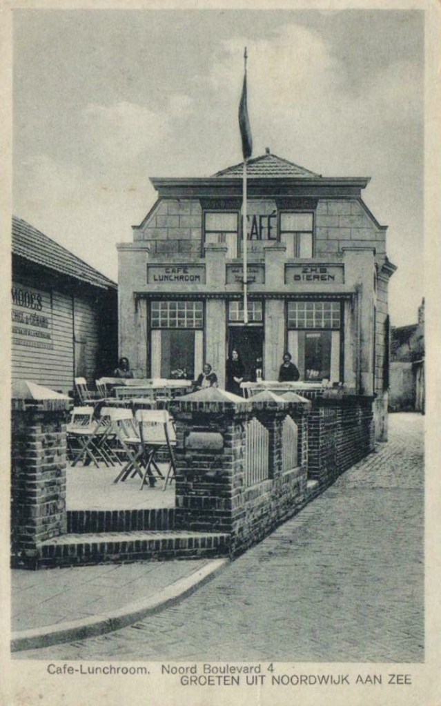 Café van de Weduwe van Schie. De Weduwe van Schie was in werkelijkheid Marijtje Kaptijn uit Lisserbroek. Zij trouwde in 1897 met Laurentius van Schie uit Warmond (daar wastie in elk geval geboren). Laurentius staat op de site van Hans Montanus te boek als “arbeider, uitbater bierhuis en caféhouder”. Laurentius stierf in 1919, nauwelijks 49 jaar oud. Zijn ‘weduwe’ zou het nog 37 jaar uithouden en stierf in 1956 op 86-jarige leeftijd. Het bierhuis annex café had ze al die jaren met verve hoog gehouden op een strategische plek aan de Noordboulevard. Of Marijtje hierboven ook op de foto staat, weet ik niet, maar ik denk van wel.