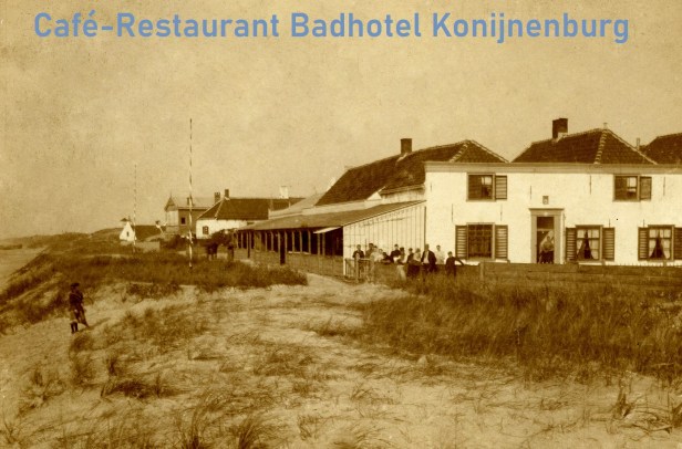Bijzondere blik op het Badhotel Konijnenburg aan een verder nog bijna onontgonnen boulevard. Schuttingen tegen het opstuivende zand. Twee visserswoningen en ‘Ons Huis’, een soortement van club- en buurthuis voor de vissersmannen op de bomschuiten. Ook nog eens ooit het buitenverblijf voor de leerlingen van het Instituut Schreuders van Noordwijk Binnen.