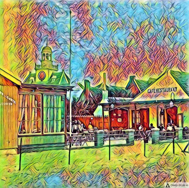 Er is een programmaatje op internet waarmee je allerlei effecten kunt uithalen. Zo ook dit effect: een opleuking van een oude foto van Badhotel Konijnenburg met felle kleuren en driftige streepjes. Bijna vangoghiaans (als ‘vangoghiaans’ een bijvoeglijk naamwoord is).