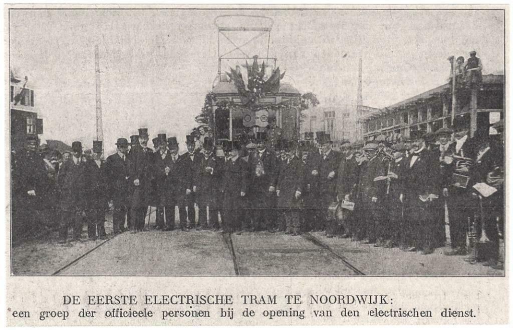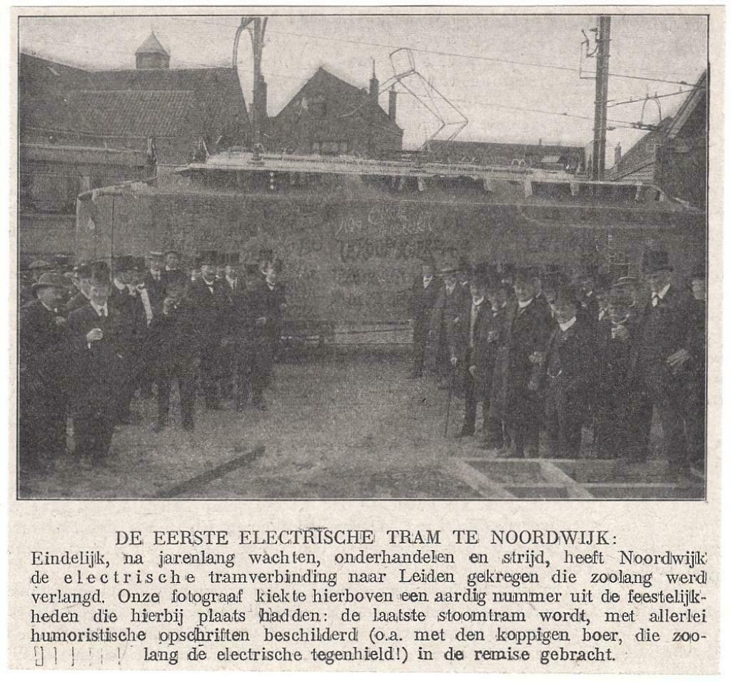 Twee persfoto’s uit een onbekende krant van de opening van de elektrische tramlijn van Leiden naar Noordwijk en vice versa in 1912.