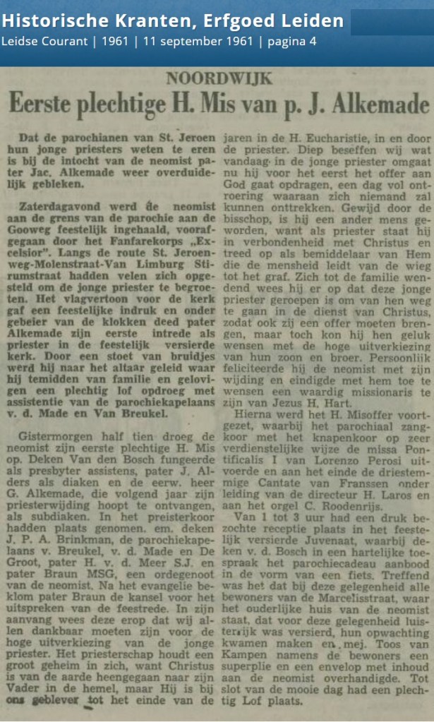 Op zondag 10 september droeg de net tot priester gewijde pater Jaques Alkemade zijn eerste Heilige Mis op in de parochiekerk van Sint Jeroen in Noordwijk Binnen. Zíjn parochiekerk ook, want Jaques stamde uit een devoot katholiek gezin uit de Marcellisstraat. Deze familie droeg de profane bijnaam ‘Zakkie’, de Hemelen weten waar die naam nou weer vandaan kwam.