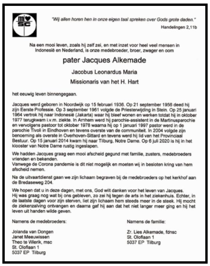 In die voornoemde Heilige Mis van Jaques mocht ik dienst doen als misdienaar en ik denk dat ik mij behoorlijk van die taak gekweten heb, want alles liep die dag goed af. In 1964 vertrok Pater Alkemade naar de missie in Indonesië, want het gevoelen was nog dat daar veel werk te doen was. Met alle respect voor Alkemade en zijn mede-missionarissen en mede-zendelingen, maar hun goede werken waren redelijk tevergeefs. Indonesië bleef voor 90% islamitisch en daarmee ook het grootste islamitische land ter wereld.