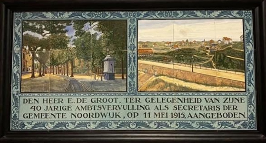 Een tijdje geleden schreven we over een prachtig tegeltableau dat werd aangeboden aan gemeentesecretaris Egbert de Groot bij gelegenheid van diens 40/jarig ambtsjubileum. Het tableau was waarschijnlijk geschilderd door ene Willem Hendrik van Norden (1883 – 1978) die verbonden was aan de Amsterdamse Plateel- en Tegelbakkerij De Distel. Kijk ook hier.