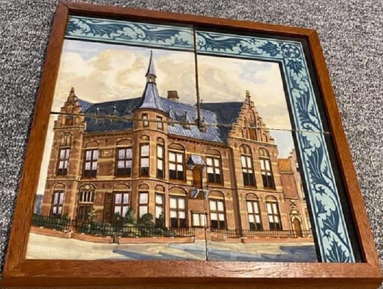 Het was al bekend dat er delen ontbraken aan het tableau. Bijzonder is dan ook dat tenminste één deel recent opdook met een afbeelding van het Raadhuis. Nu duimen dat de rest (er zouden nóg twee delen bestaan) ook nog teruggevonden gaat worden.