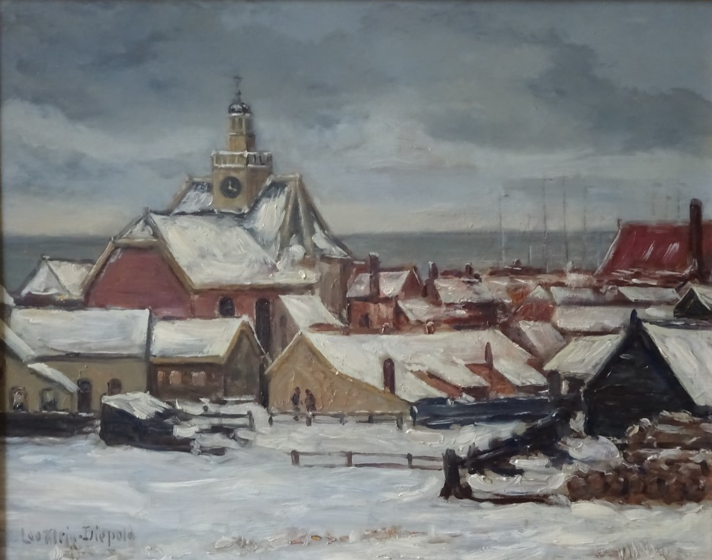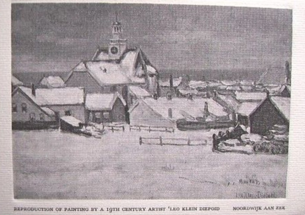 Reproductie van een schilderij van Leo Klein Diepold, een winterlandschap in Noordwijk aan Zee. Van het origineel heb ik één, zij het niet heel goede afdruk. Het vreemde met dit schilderij is dat het ooit in Noordwijk circuleerde (bij het GON?), maar dat het om onnaspeurlijke redenen verdwenen is. Niemand weet waar of dat het schilderij zich bevindt. Wie het weet, melde zich en hij of zij verdient een voetreis naar Rome.
