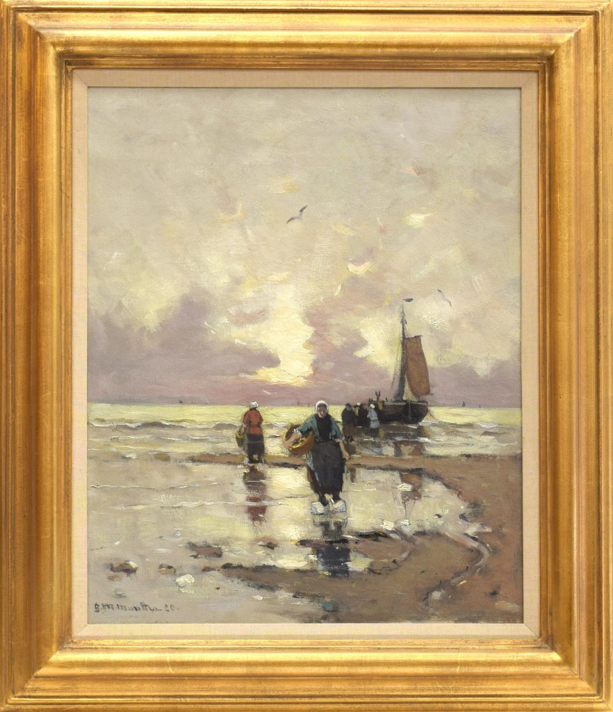 Morgenstern Munthe was a great admirer of the Hague School. Irresistibly drawn to the North Sea, he settled in The Hague in 1897. As a regular guest of the Kurhaus, he painted Scheveningen bombs (fishing boats) in the surf. Munthe painted in 3 periods in The Hague and Scheveningen. The Hague 1897-1901 and 1908-1912. The family goes to Zierikzee in 1912, but returns to The Hague in 1913 and stays there until 1914, after which they move to Noordwijk. Morgensterne Munthe was the son of the Norwegian painter Ludvig Munthe and spent most of his life in Dusseldorf and became a professor at the Academy there in 1893. During his life he made many trips to the Netherlands and he was a great admirer of the painters of the Hague school. He therefore found his subjects mostly on the North Sea coast near Scheveningen and Katwijk, which village he visited for the first time in 1889, after which he spent the summer months in Katwijk. In 1897 he moved to The Hague and H.W. Mesdag introduced in the artistic environment. In 1901 he and his wife moved into the house Huize Sigrid on the Noord boulevard in Katwijk, on the edge of the beach. He stayed there until 1908 and then returned to The Hague. Munthe painted in 3 periods in The Hague and Scheveningen. The Hague 1897-1901 and 1908-1912. The family goes to Zierikzee in 1912, but returns to The Hague in 1913 and stays there until 1914, after which they move to Noordwijk and died in 1927. The painting which is now offered for sale was made by the artist in 1920 at the Nordsea coast of Noordwijk (the Netherlands). The painting is lower right signed and dated. The work is framed in a wooden frame with gold leaves. The frame is handmade.
