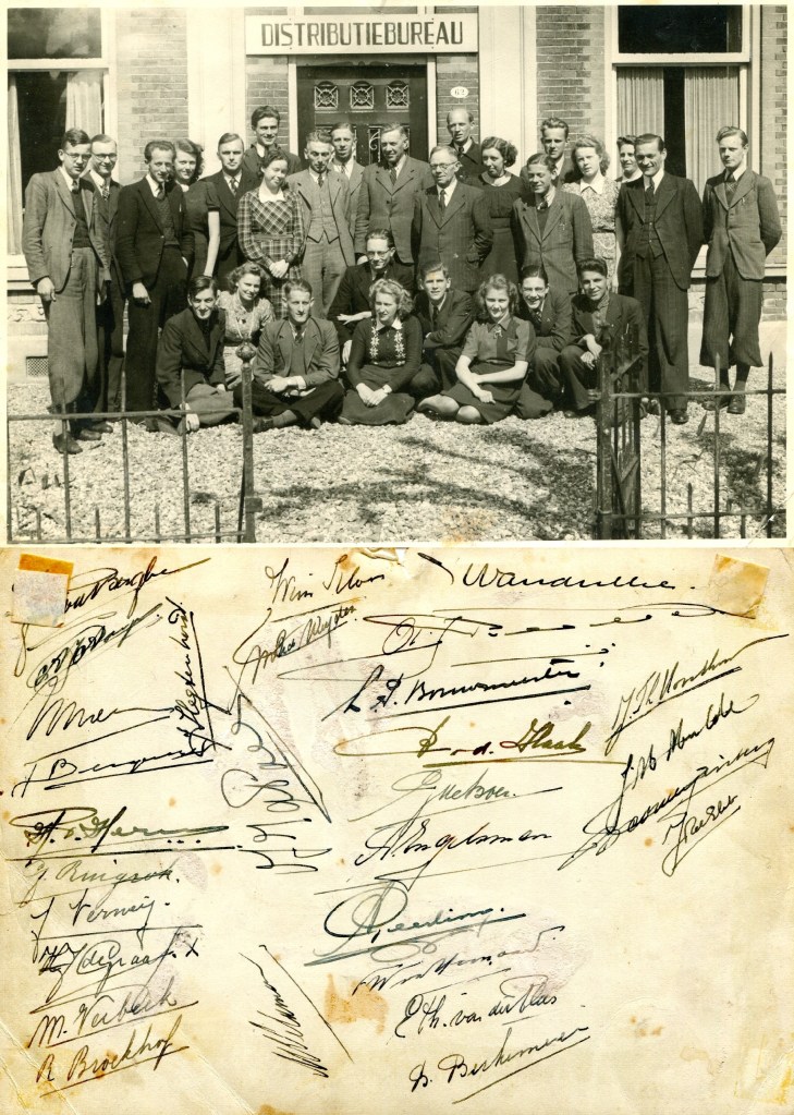 In de oorlog was er het distributiekantoor van de gemeente Noordwijk. Wat die al zo te distribueren had, laat zich raden: voornamelijk voedselbonnen. Het personeel van het kantoor poseerde groepsgewijs voor hun pand aan de Pickéstraat. Op JBEEN duikt bovenstaand, uniek exemplaar van die posade op met op de achterkant de handtekeningen van alle leden. Voor wie het niet lezen kan en voor wie wil weten wie wie is: