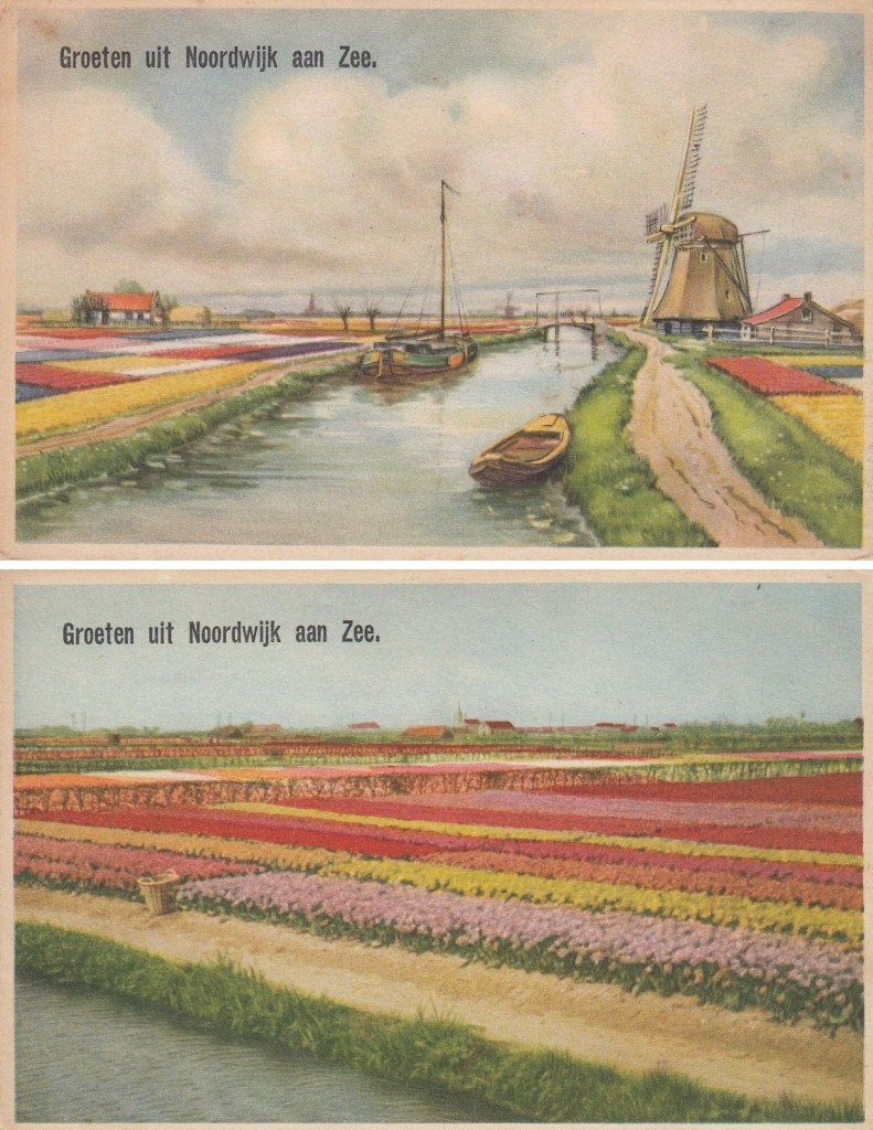 Twee fantasievolle kaarten die de groeten doen uit Noordwijk aan Zee. Maar van Noordwijk aan Zee is niet veel te bekennen. Bij nadere bestudering van de kaart: van Noordwijk-Binnen evenmin.