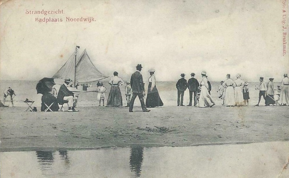 Braakman fotografeerde een aantal wandelaars aan het strand in Noordwijk. Men wandelde, men baadde geen pootje, laat staan dat men zwom. Braak moest de onderscheidene figuren wel met enige dunne lijntje extra accent geven, anders was het allemaal te vaag geworden.