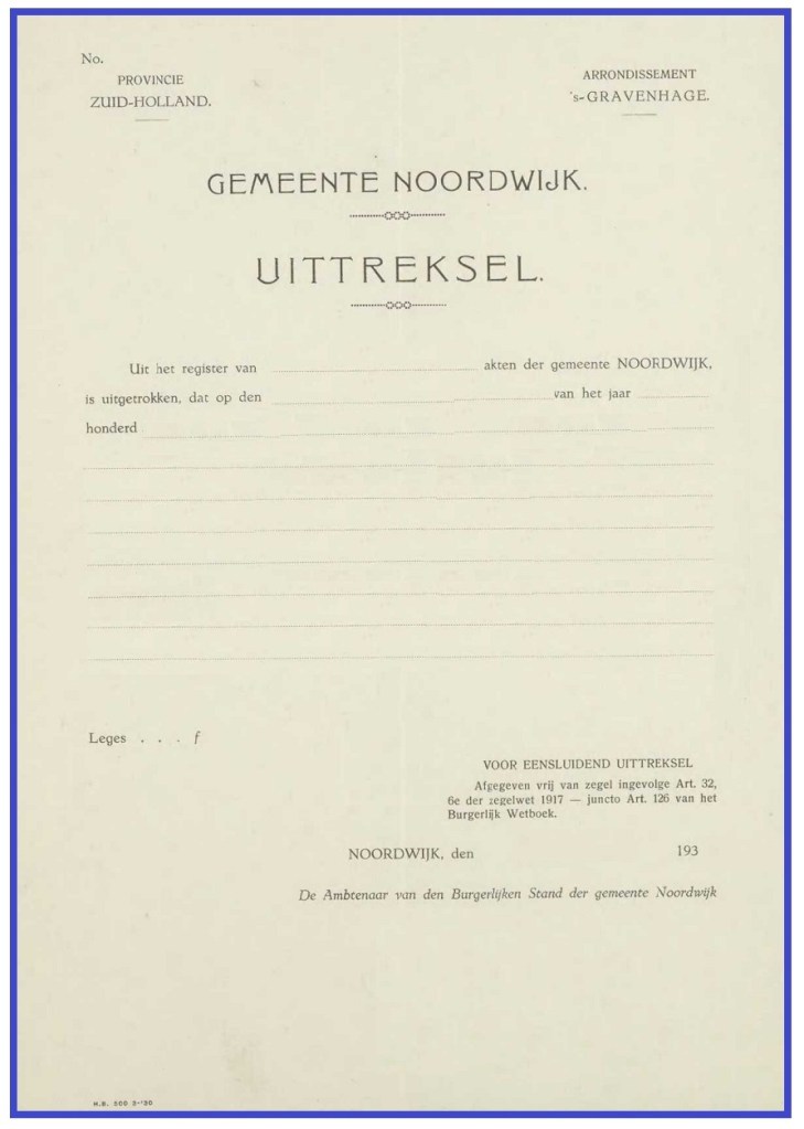 Als je in 1931 bij de Gemeente Noodwijk om een Uittreksel Burgerlijke Stand ging vragen, kreeg je een op dit format ingevuld verhaal mee. De blauywe rand heb ik er voor de sier zelf maar omheen gezet. Die creativiteit en mogelijkheid waren toen in het Raadhuis niet aanwezig.