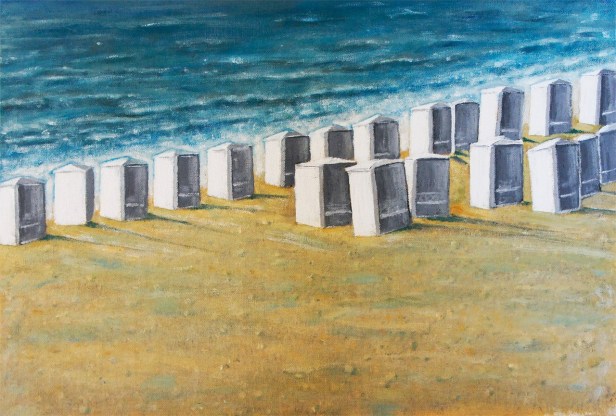 Bill Imthorn – far away from Noordwijk – schilderde dit beeld van Noordwijk in acryl op basis van een oude foto. Naar aanleiding van een recent blog over de badhokjes van Rein Dool. Volgens mij waren de Imthorns een geslacht van huisschilders (uit de Bronckhorststraat?). Bill is niet alleen fysiek, maar ook qua schilderen een andere kant op gegaan 🙂 .