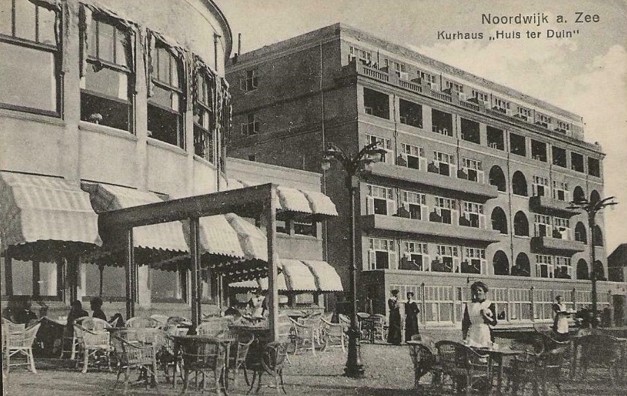 Een bijzondere, want niet eerder geziene foto van het terras van Huis ter Duin. Diensters in de weer, een klein gezelschap in de schaduw onder de markiezen, een grote glazen afscheiding om de wind weg te houden. Schitterende lantaarnpalen ook. Een soortgelijke foto van eerdere datum: