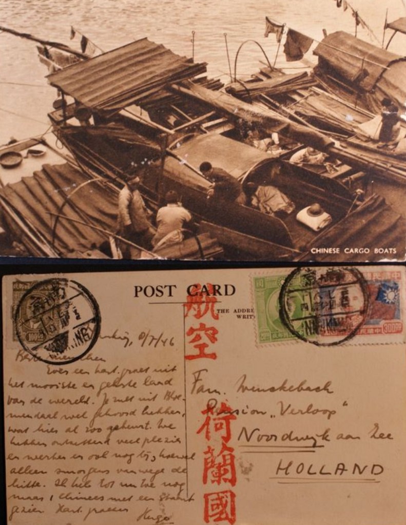 De familie Wenckebach kreeg een niet-alledaagse kaart uit het Chinese Nanking, gedateerd op 8 juli 1946. Wenckebach was – at the time – directeur van Pension Verloop, vandaar de adressering. De afzender van de kaart, ene Hugo, maakt een ongemakkelijke opmerking: “Ik heb tot nu toe nog maar 1 Chinees met een staart gezien.”