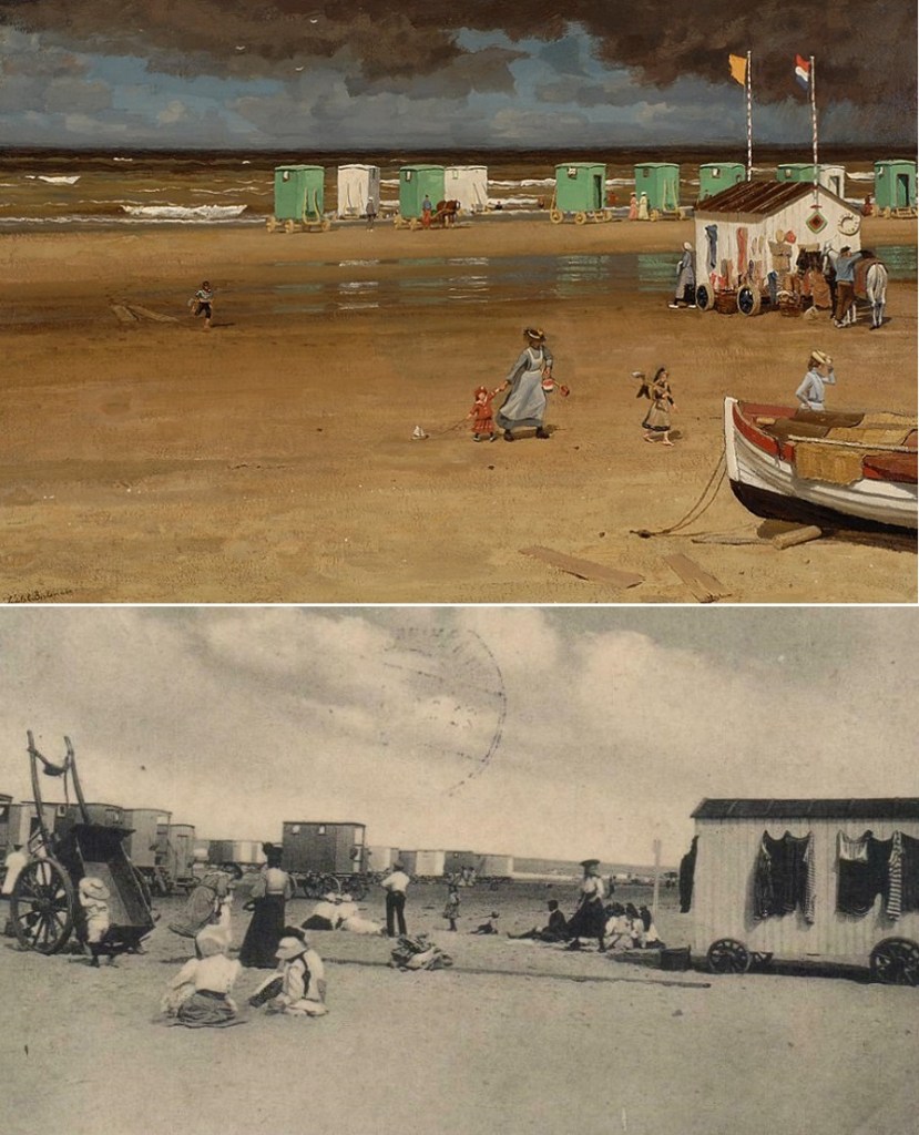 Of Berkemeier echt in de zeereep zat te schilderen of dattie thuis met een fotootje voor zijn neus de boel zat na te maken, is de vraag. Tenminste één foto zal hem bij het schilderen hebben kunnen helpen. Die kar, waar de zwemkleding aan te drogen hing, komt in ieder geval in beide beelden terug. Of in deze: